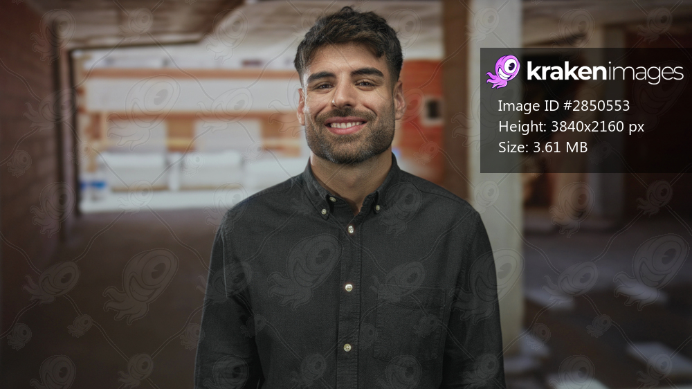 Man smiles showing face against unfinished brick wall inside building under construction; confidence.
