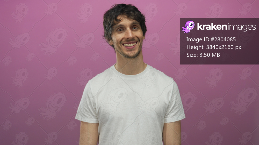 Man smiles showing teeth with sparkling eyes and tilts head revealing face in pink studio; happiness.