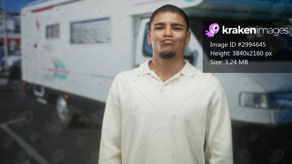 Man smiles showing teeth while standing by a camper van on street wearing a cream polo and goatee; joyful road trip.