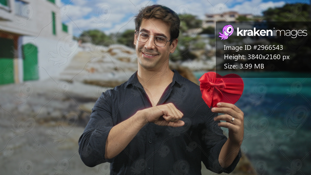 Man smiles wearing glasses and ring, holding red heart gift and points fist forward at building by a turquoise sea and rocky coastline; romance invitation. - Kraken Images