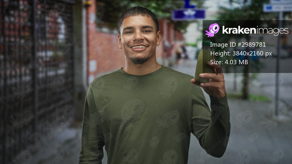 Man smiles while holding green juice bottle with hand raised on a city street near a brick wall; friendly wellness.