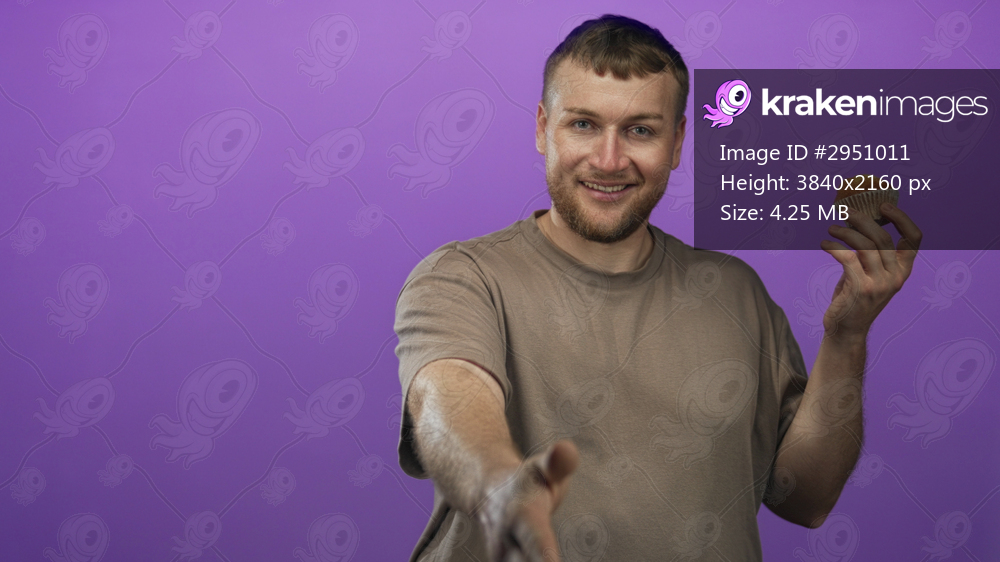 Man smiling with arm extended offering a handshake while holding a muffin in a purple studio; friendly invitation.