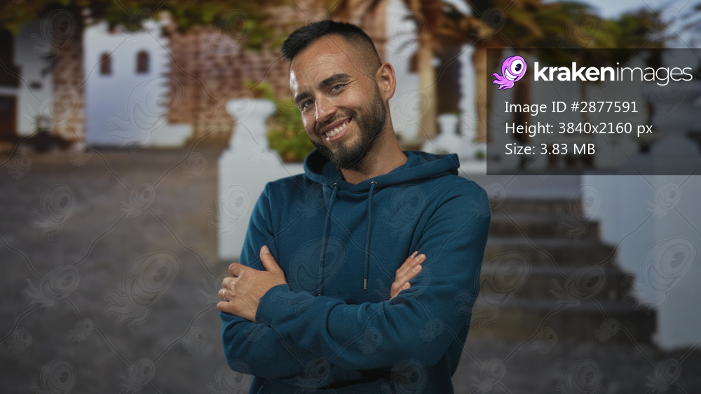 Man smiling with arms crossed and hands visible wearing hoodie in front of white building with stairs and planters; confidence friendliness.