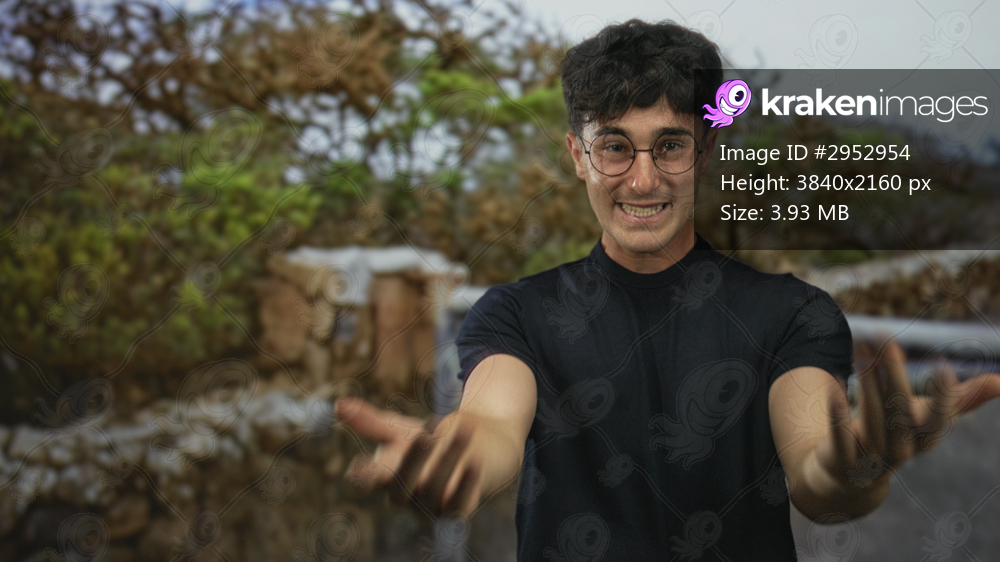 Man smiling with arms crossed hugging himself in a forest setting by stone wall, wearing glasses and black shirt; comfort selfcare.