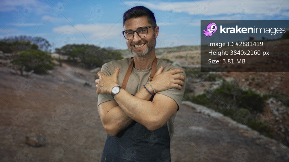 Man smiling with arms crossed hugging himself in park with green shrubs and blue sky, wearing apron and glasses, bearded and tanned; contentment kindness. - Kraken Images