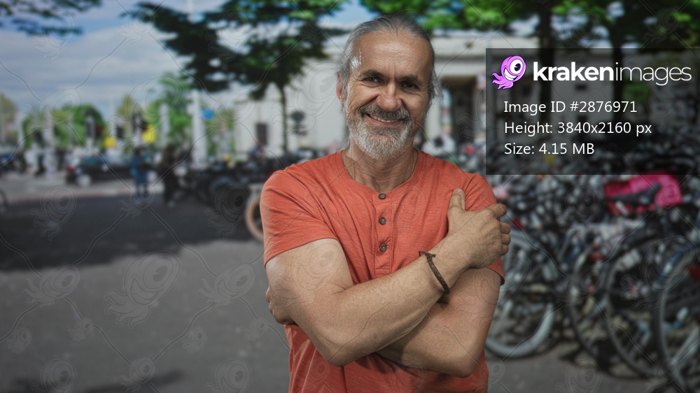 Man smiling with arms crossed hugging his shoulder on street by bicycle parking, city outdoors near parked bikes; everyday contentment.