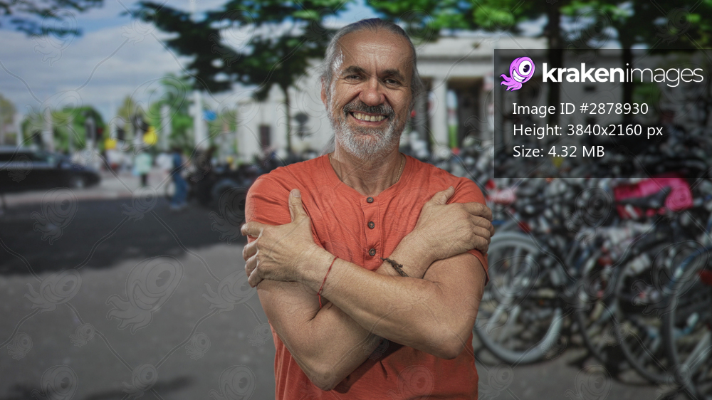 Man smiling with arms crossed hugging his shoulder on street by bicycle parking, city outdoors near parked bikes; everyday contentment.