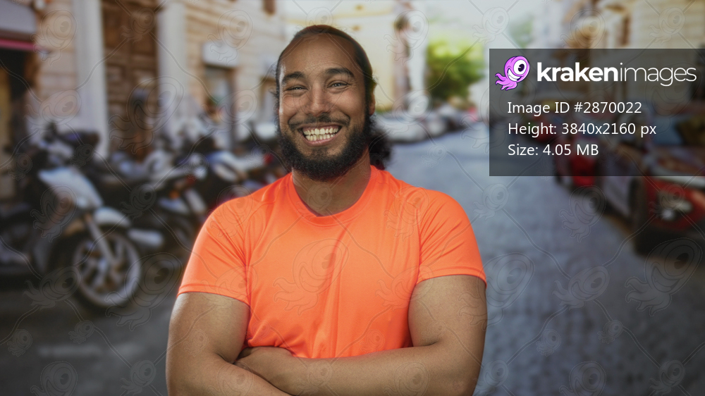 Man smiling with arms crossed on a busy street lined with scooters and cars, wearing bright orange shirt; joy confidence.