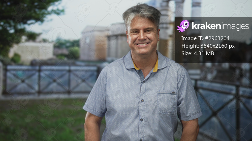 Man smiling at camera by an old building with columns and railing, wearing a collared shirt and shortsleeve; nostalgic contentment.