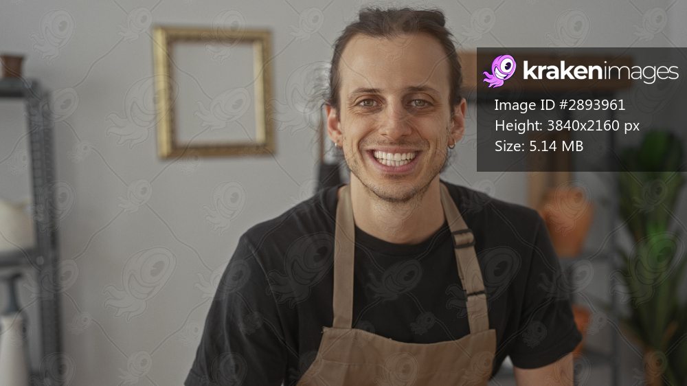 Man smiling at camera wearing canvas apron, leaning over clay pots and pottery tools on metal shelves in studio; craft pride contentment.