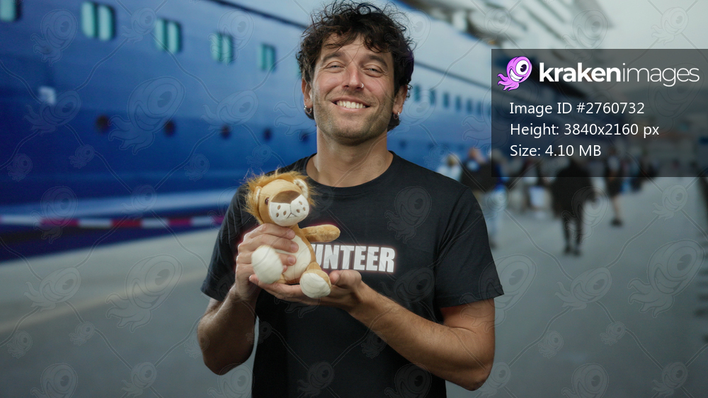Man smiling at port with toy, handsome hispanic volunteer holding stuffed animal by docked cruise ship.