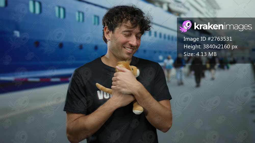 Man smiling at port with toy, handsome hispanic volunteer holding stuffed animal by docked cruise ship.