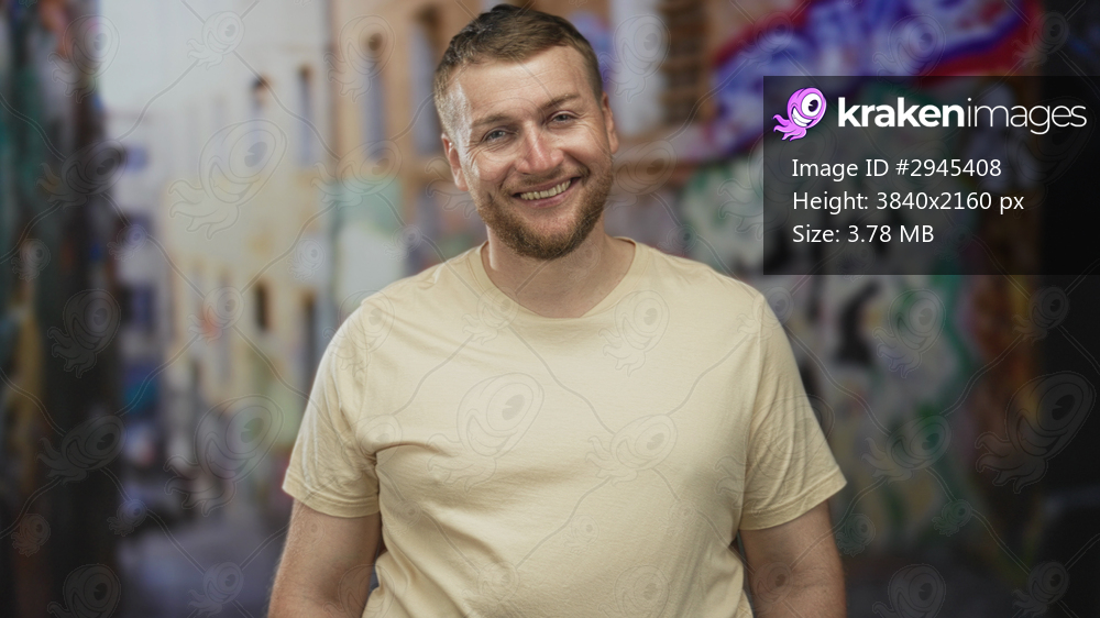 Man smiling with bare face and visible teeth in a beige t shirt on a graffiti street, leaning toward camera; casual urban happiness.