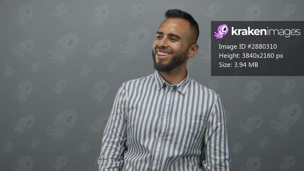 Man smiling with beard in gray studio, wearing a blue striped shirt and looking to the side with relaxed posture; happiness.
