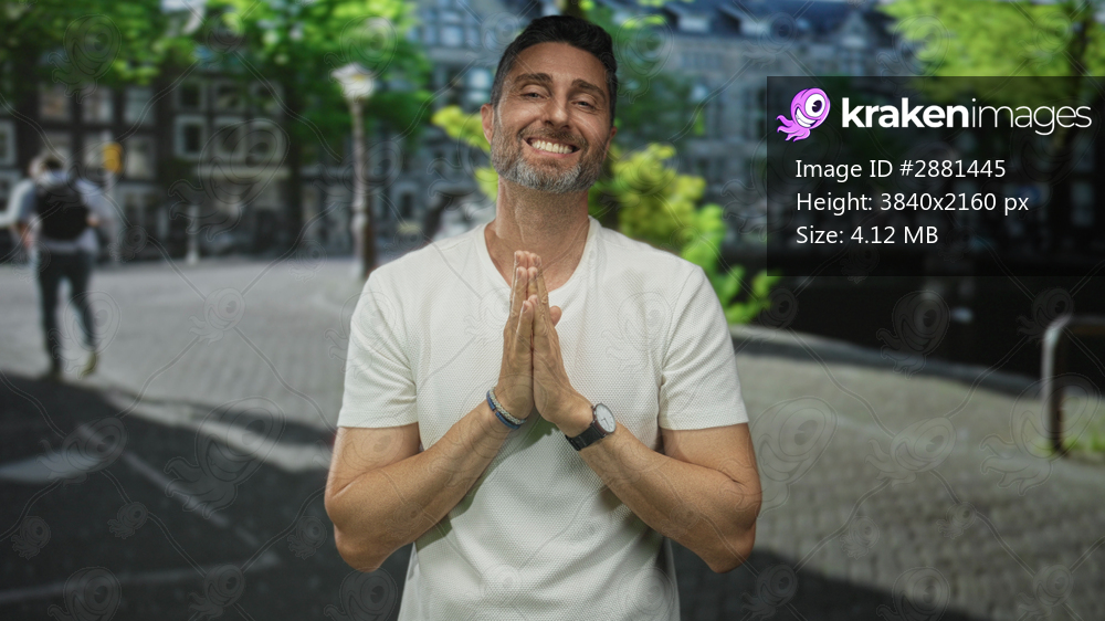 Man smiling with beard standing on sunlit street by canal and old building, relaxed posture; contentment.