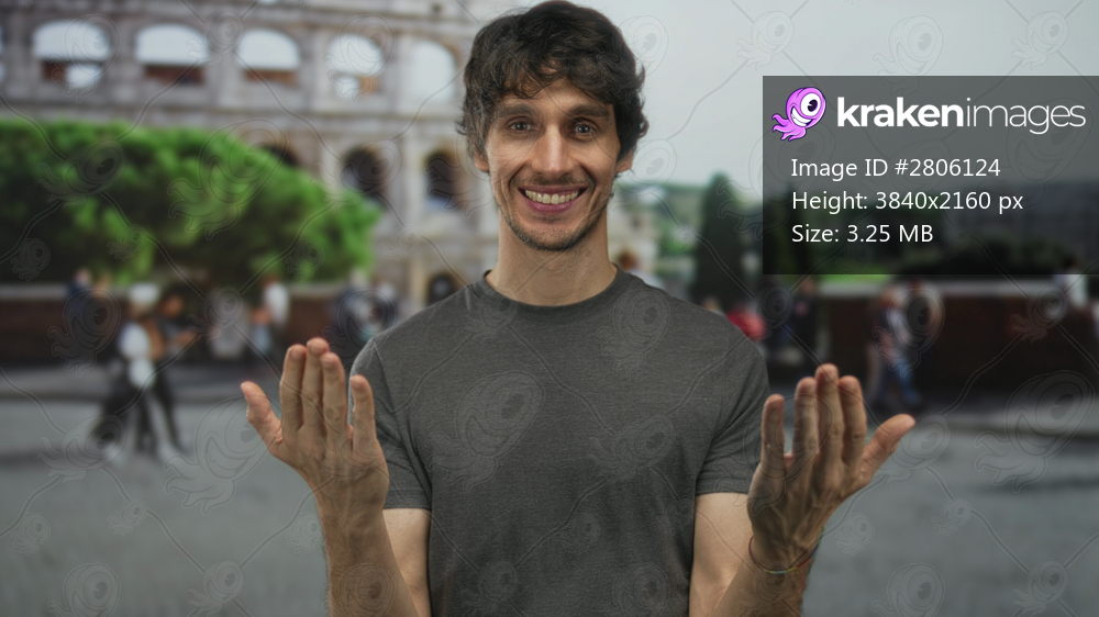 Man smiling beckons with hands in front of colosseum building; travel exploration heritage happiness.