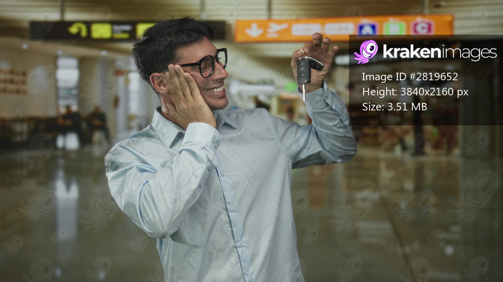 Man smiling broadly while holding car key fob at airport terminal and touching his cheek; excitement.