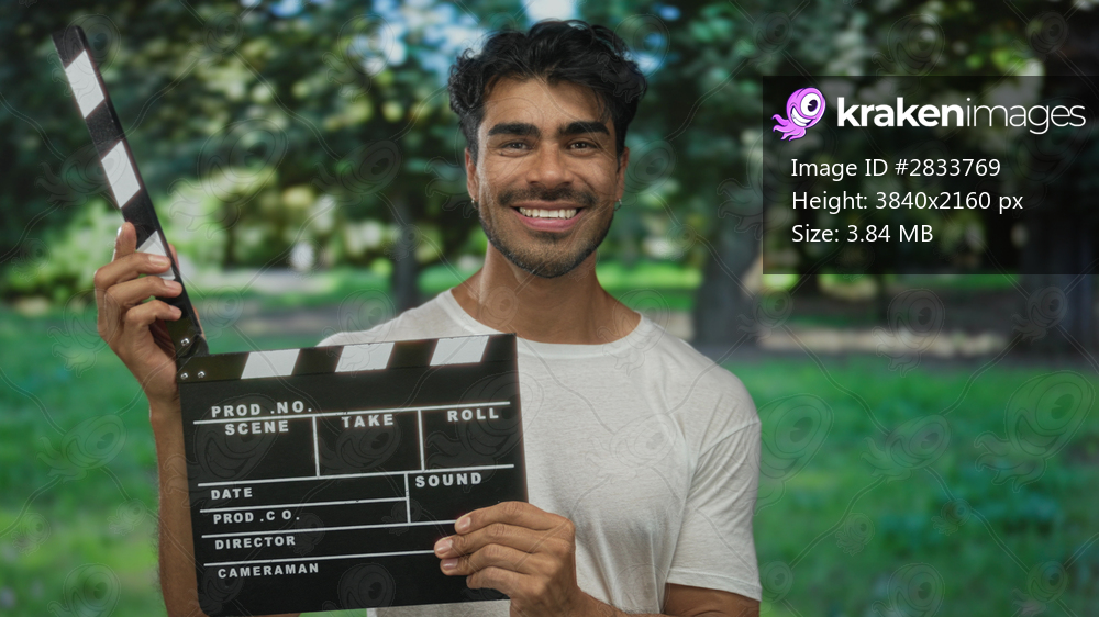 Man smiling broadly while holding clapboard and lifting clapper stick in forest under green foliage; joy.