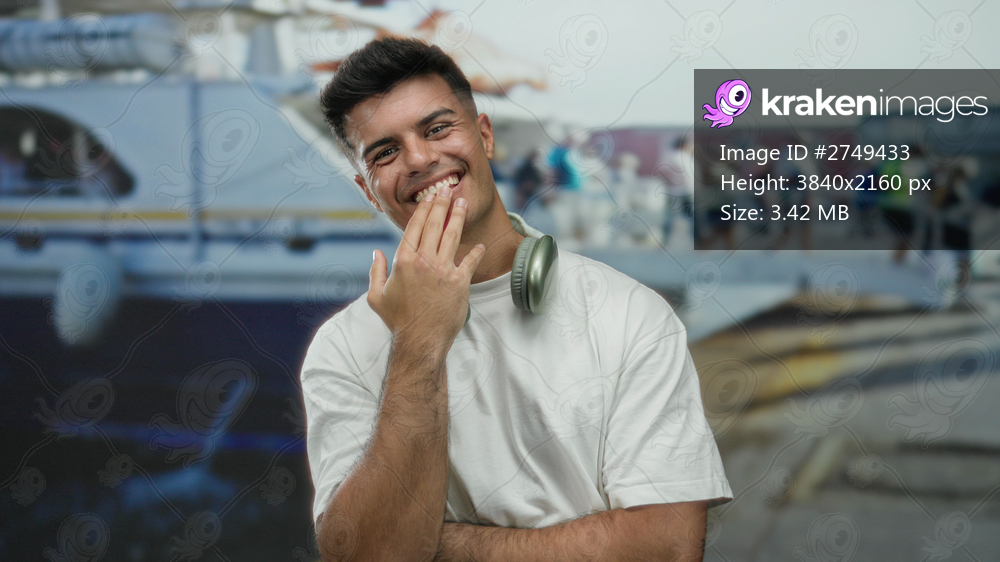 Man smiling by a boat at the seaside with headphones around his neck, exuding warmth and friendliness in an outdoor setting with people in the background. - Kraken Images
