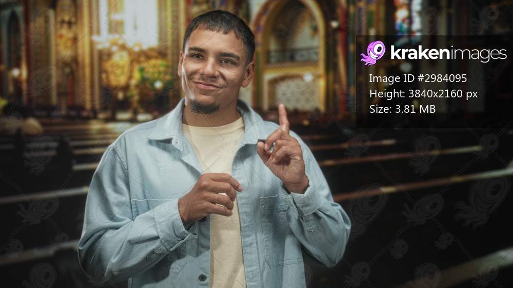 Man smiling with clasped hands in an ornate church building, light jacket and t shirt visible, pews and stained glass behind him; serene reflection.