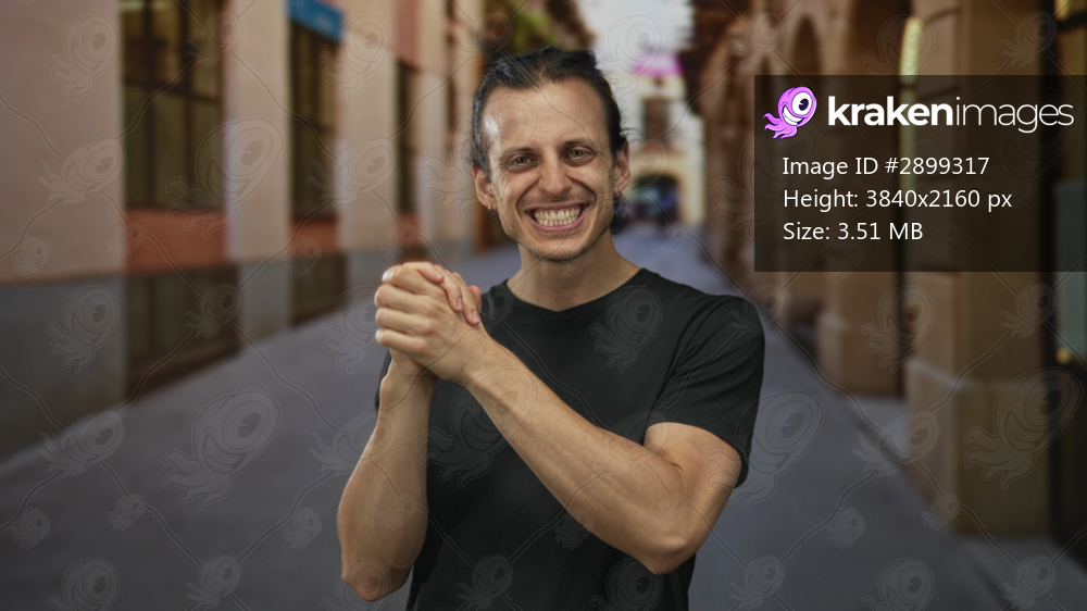 Man smiling with clasped hands and visible forearms on old town street framed by stone buildings, wearing black t shirt with tied long hair; urban joy. - Kraken Images