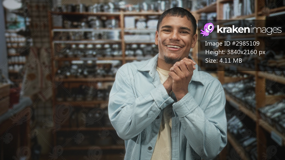 Man smiling and clasping hands wearing a light denim jacket standing amid wooden shelves of glass jars and labeled containers in a small shop building; quiet contentment. - Kraken Images