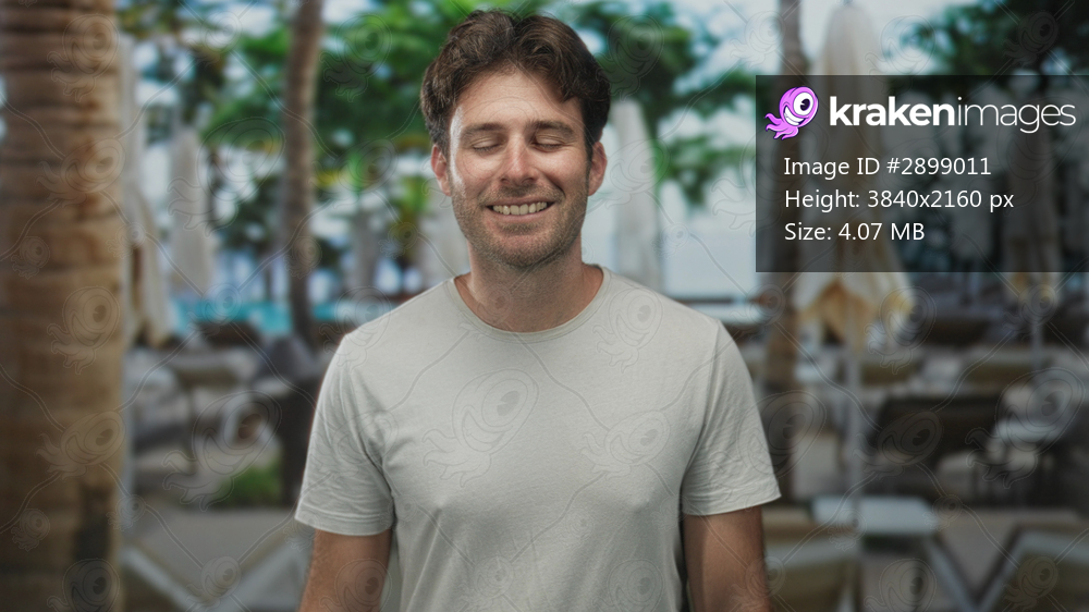 Man smiling with closed eyes by hotel pool building, wearing tee and neutral posture; serenity vacation.