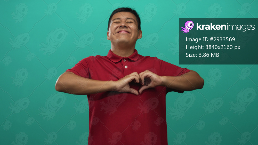 Man smiling with closed eyes forming heart with hands in teal studio setting wearing red shirt; love.