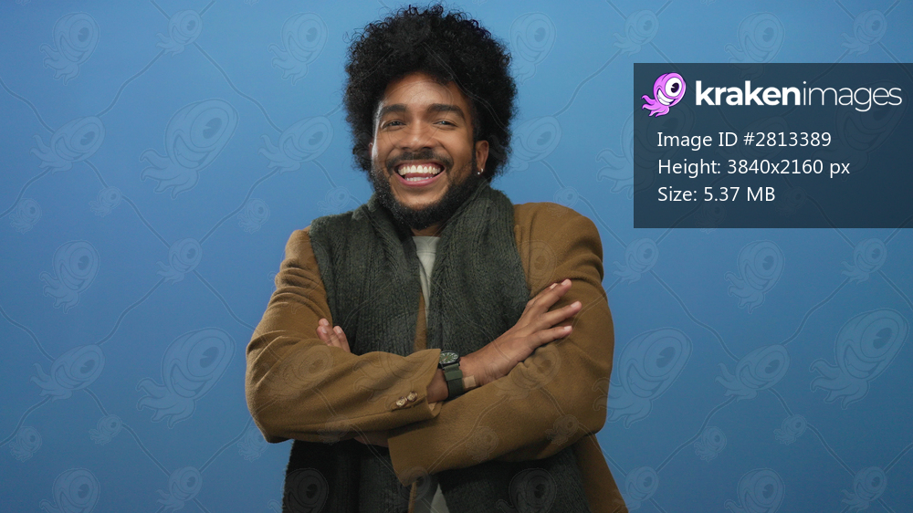 Man smiling confidently with folded arms wearing a coat and scarf against a blue wall, showcasing happiness and warmth.