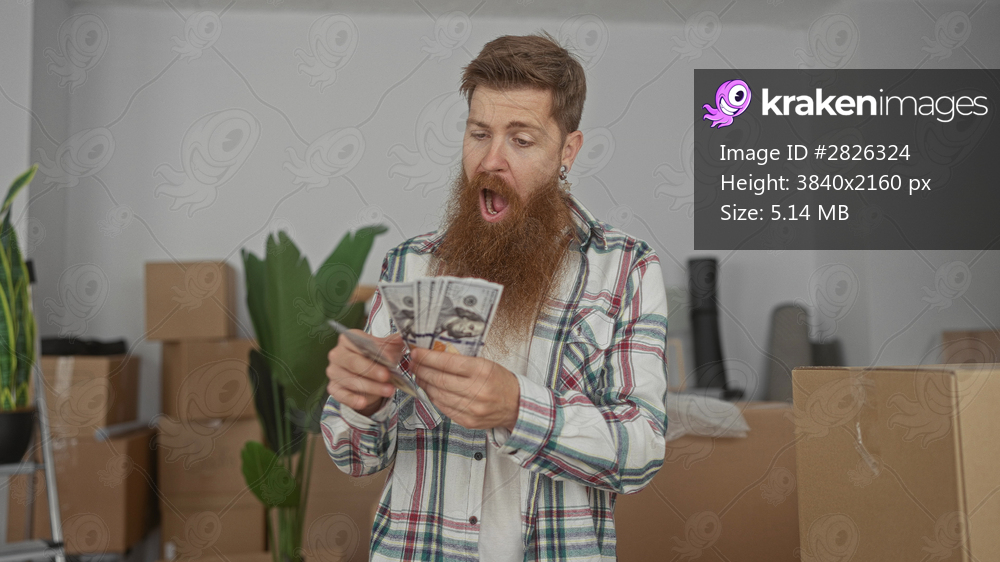 Man smiling and counting cash with bare hands in a building cluttered with boxes; financial prosperity joy.