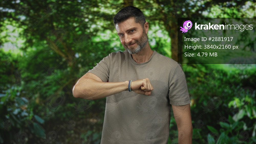 Man smiling and extending fist toward camera in forest, bare forearm visible and wearing a casual short sleeve shirt; confidence.