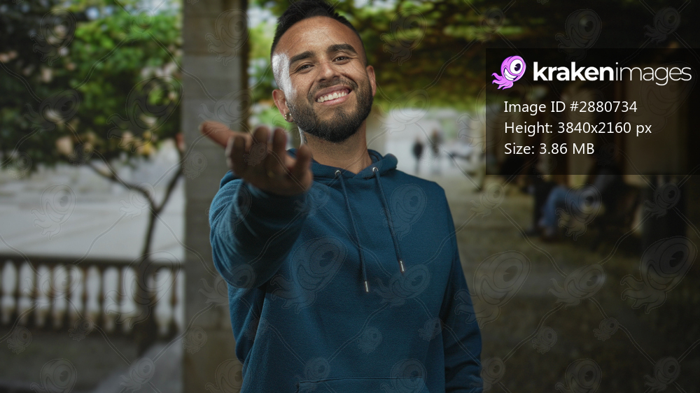 Man smiling and extending right hand toward camera on street arcade with stone columns, benches and leafy trees; open invitation welcoming.