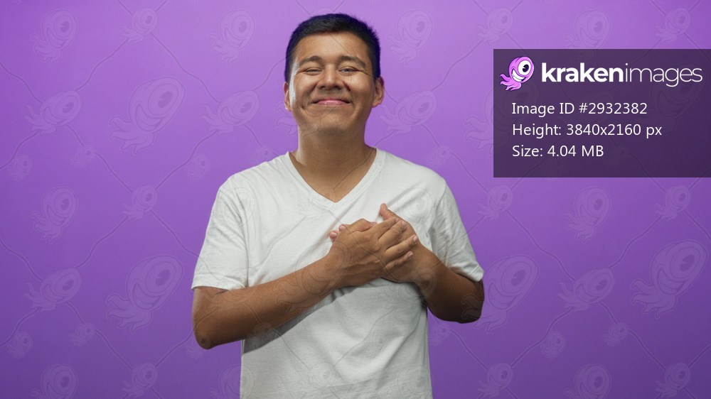Man smiling with eyes closed holding hands to chest in studio against purple backdrop with soft smile; gratitude.