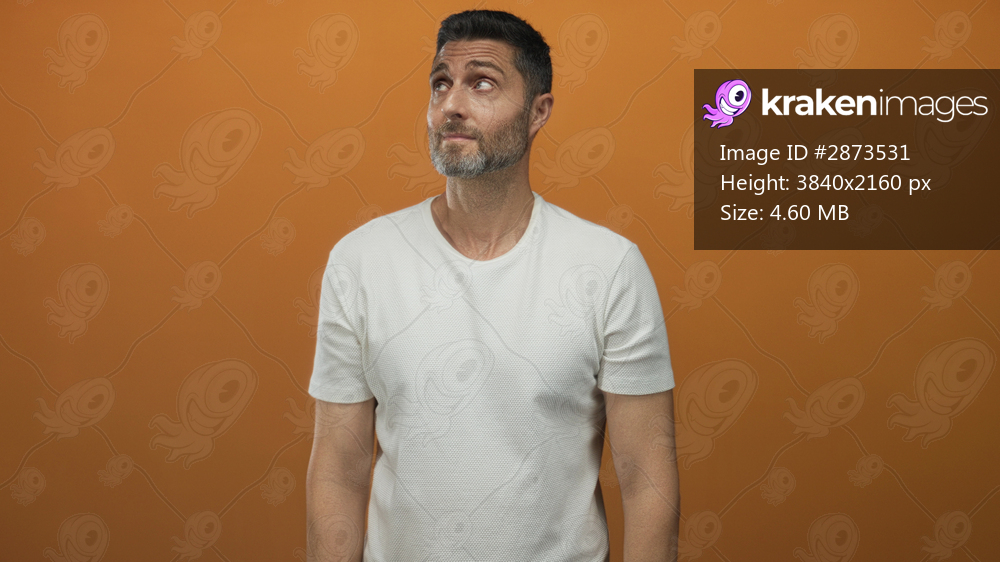 Man smiling with eyes closed in orange studio wearing a white t shirt and relaxed pose showing forearms; amused casual.