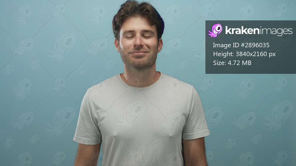Man smiling with eyes closed, visible face and bare neck in blue studio, relaxed casual pose and gentle smile; serenity.