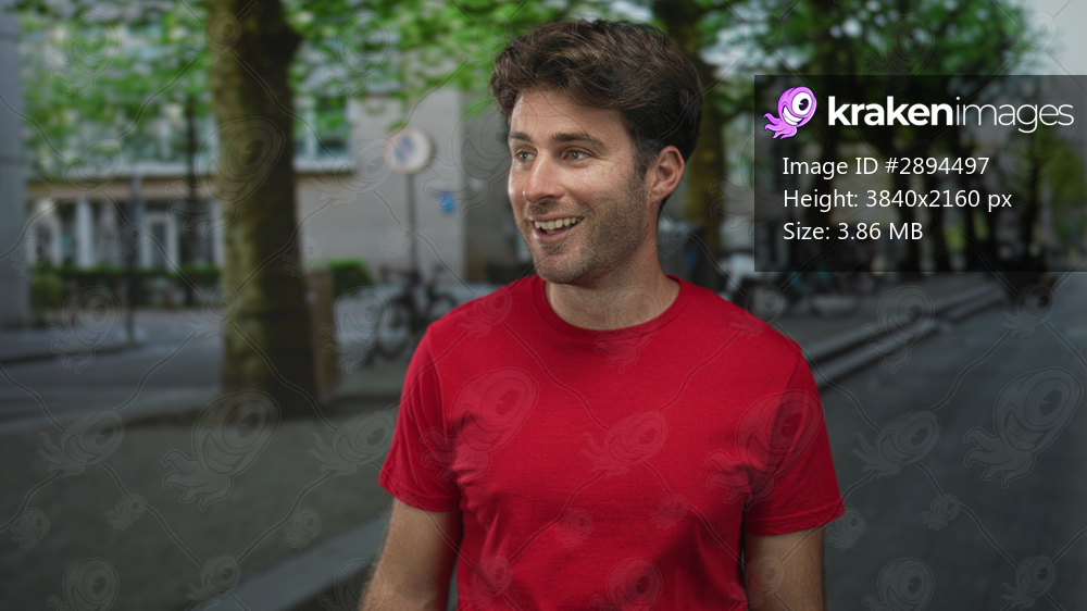 Man with smiling face on a city street wearing a red t shirt, standing by trees and bicycles, looking toward camera; casual happiness approachable.