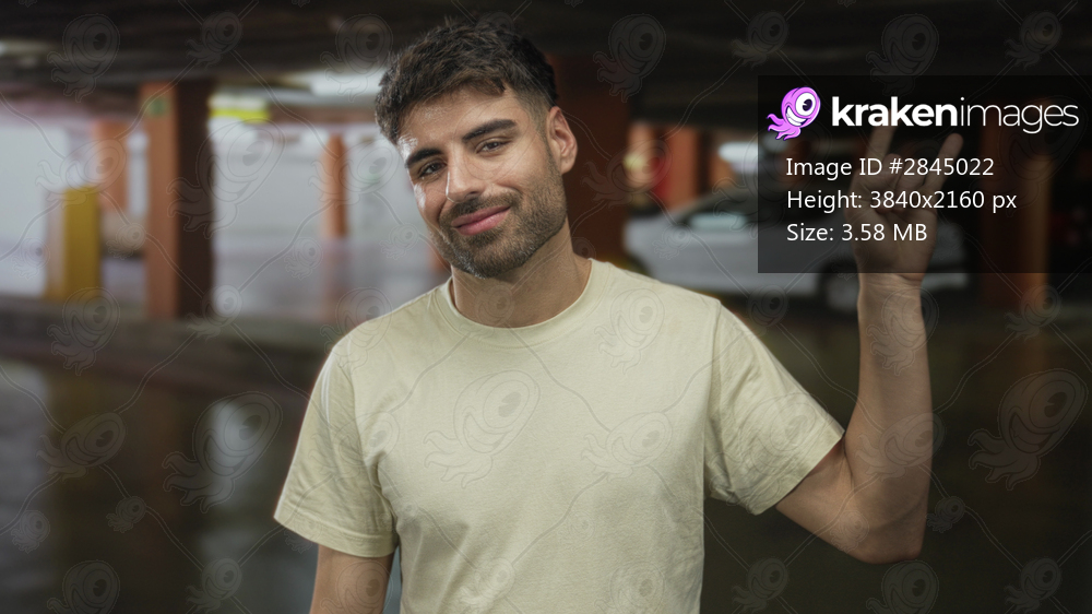 Man with smiling face and rock horns gesture beside white car in indoor parking building; fun energy.