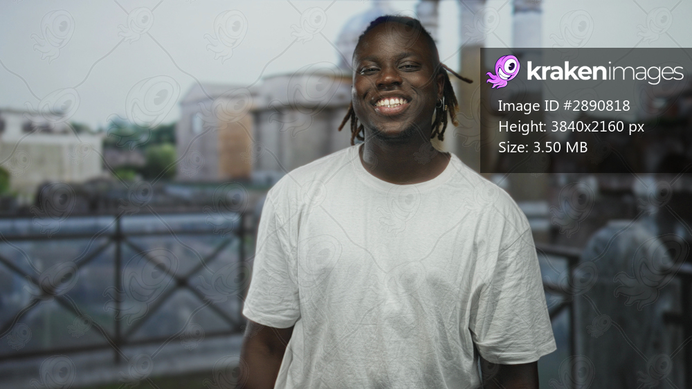 Man smiling with face and teeth visible, wearing white t shirt, standing on old town street in front of stone railing; joy urban youth.