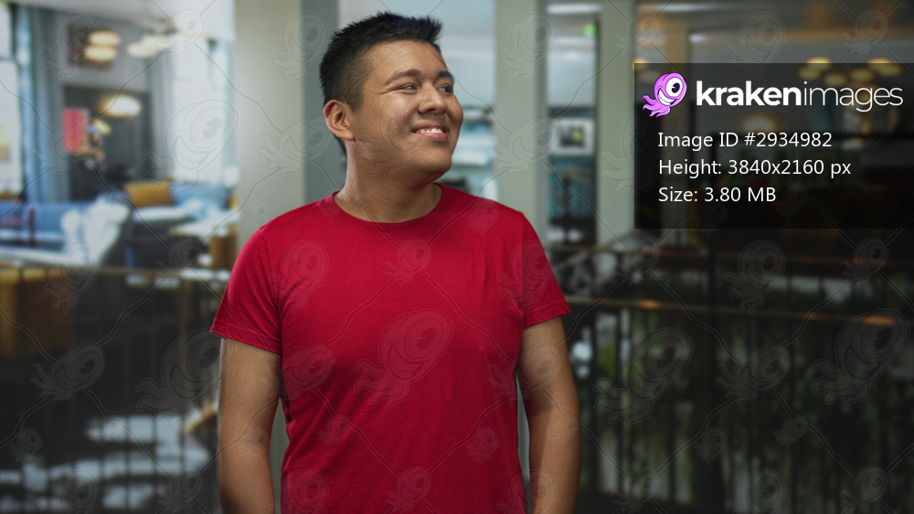 Man smiling with face turned to the side in a hotel lobby wearing a red tshirt with casual posture; relaxed travel ease.
