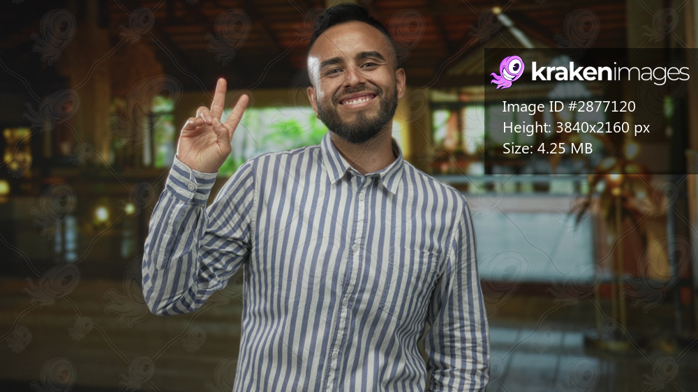 Man smiling and flashing double peace signs with hands and visible beard in hotel lobby building near reception desk, wearing striped shirt; joy.