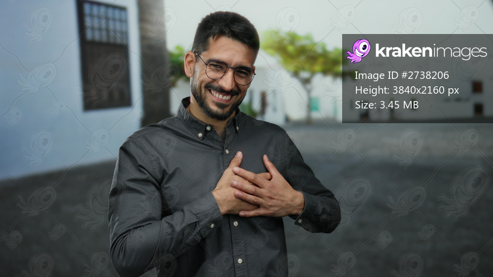 Man smiling and forming a heart shape with his hands on a street with blurred buildings and trees in the background, exuding charm and warmth.