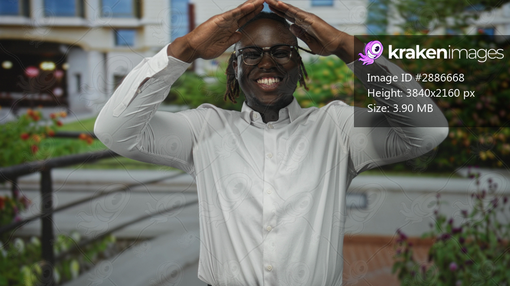 Man smiling and forming a roof with hands in front of building and landscaped walkway; joy welcome warmth.