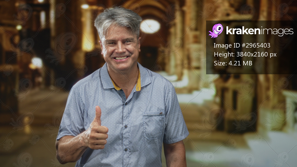 Man smiling and giving thumbs up with visible thumb in ornate historic building interior; optimism confidence.