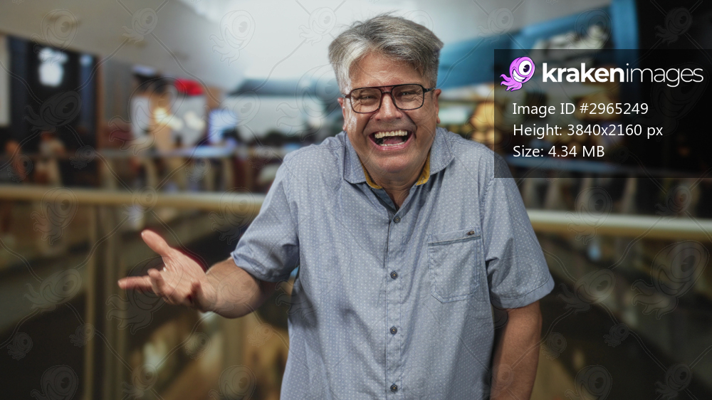 Man smiling with hand extended by airport railing, wearing glasses and short sleeve shirt, laughing openly; joy warmth.