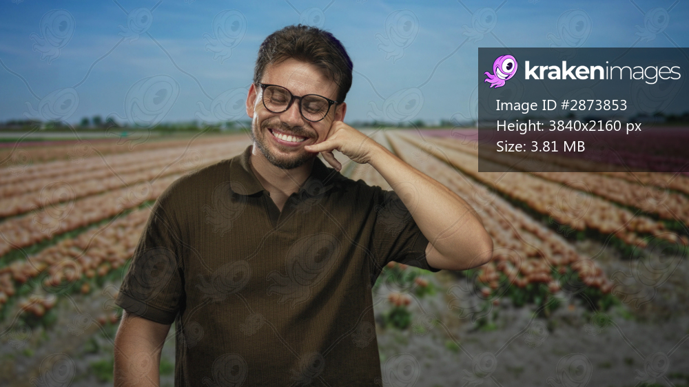Man smiling with hand held to his ear in call gesture among rows of tulip flowers in a rural field at midday; playful.