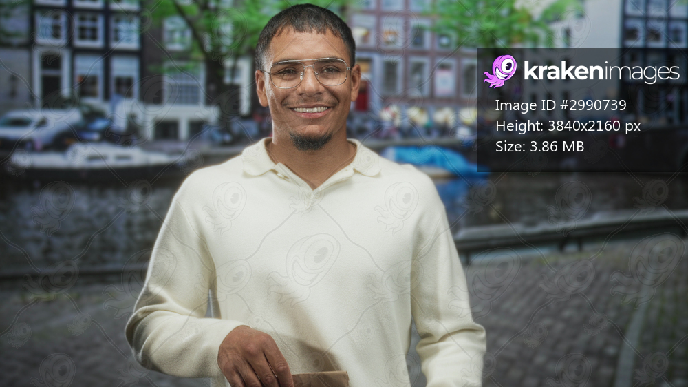 Man smiling, hand holding paper bag on a cobblestone street beside a canal and city buildings; cheerful delivery moment.