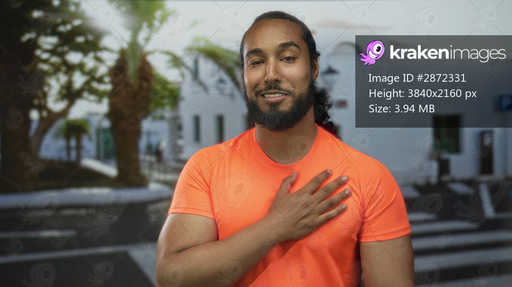 Man smiling with hand on chest in bright orange shirt on street by building and crosswalk; gratitude sincerity.