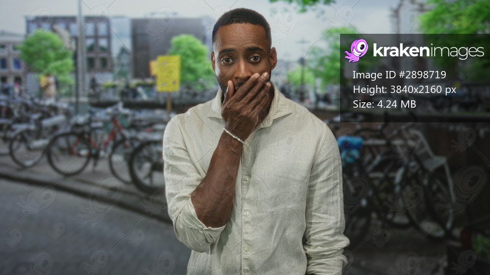 Man smiling with hand to chest and bracelet visible on an amsterdam canal street with bicycles behind him; city travel contentment.