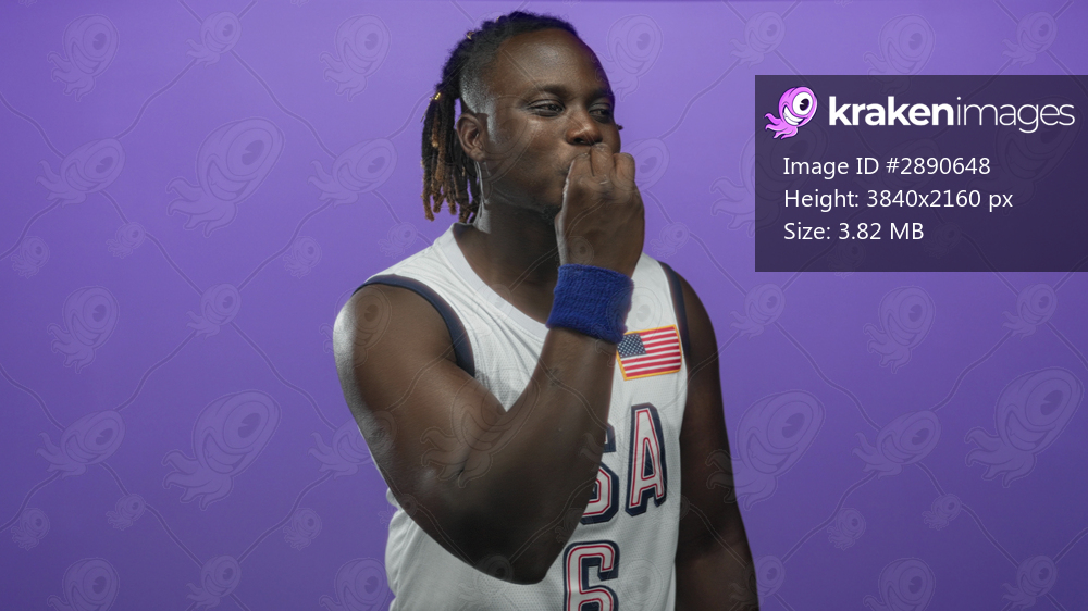Man smiling with hand to face wearing usa basketball jersey and blue wristband in purple studio; joyful confidence.