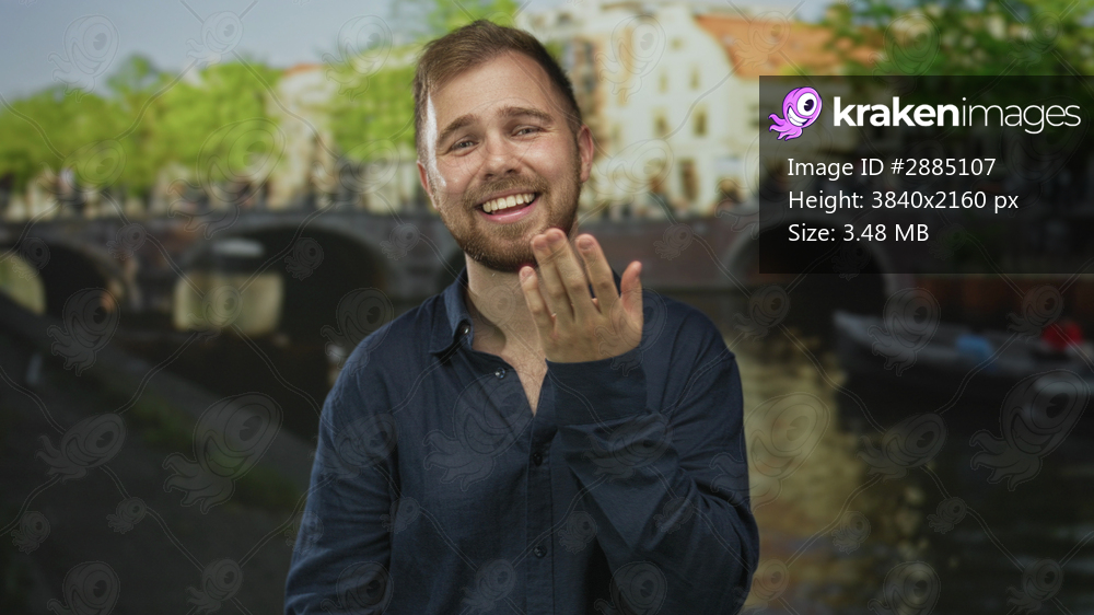Man smiling with hand to mouth and open palm gesture, navy shirt, standing by canal and bridge on amsterdam street; playful warmth.